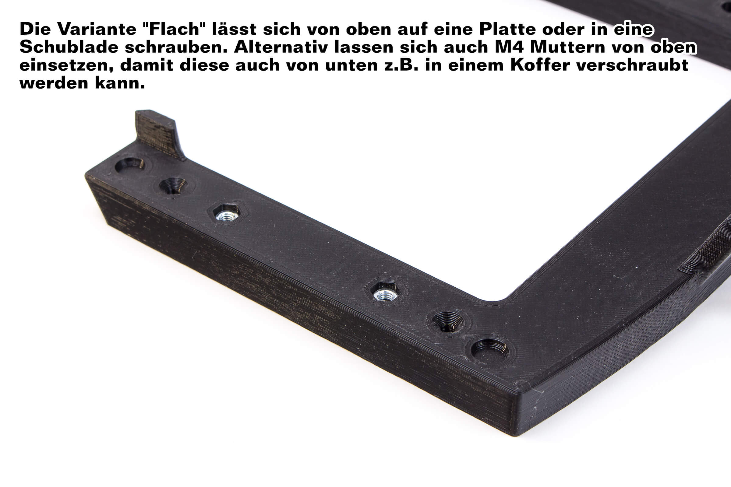 Alternativ lassen sich M4-Muttern einlegen, um die Halterung von unten (z. B. im Transportkoffer) verschrauben zu können